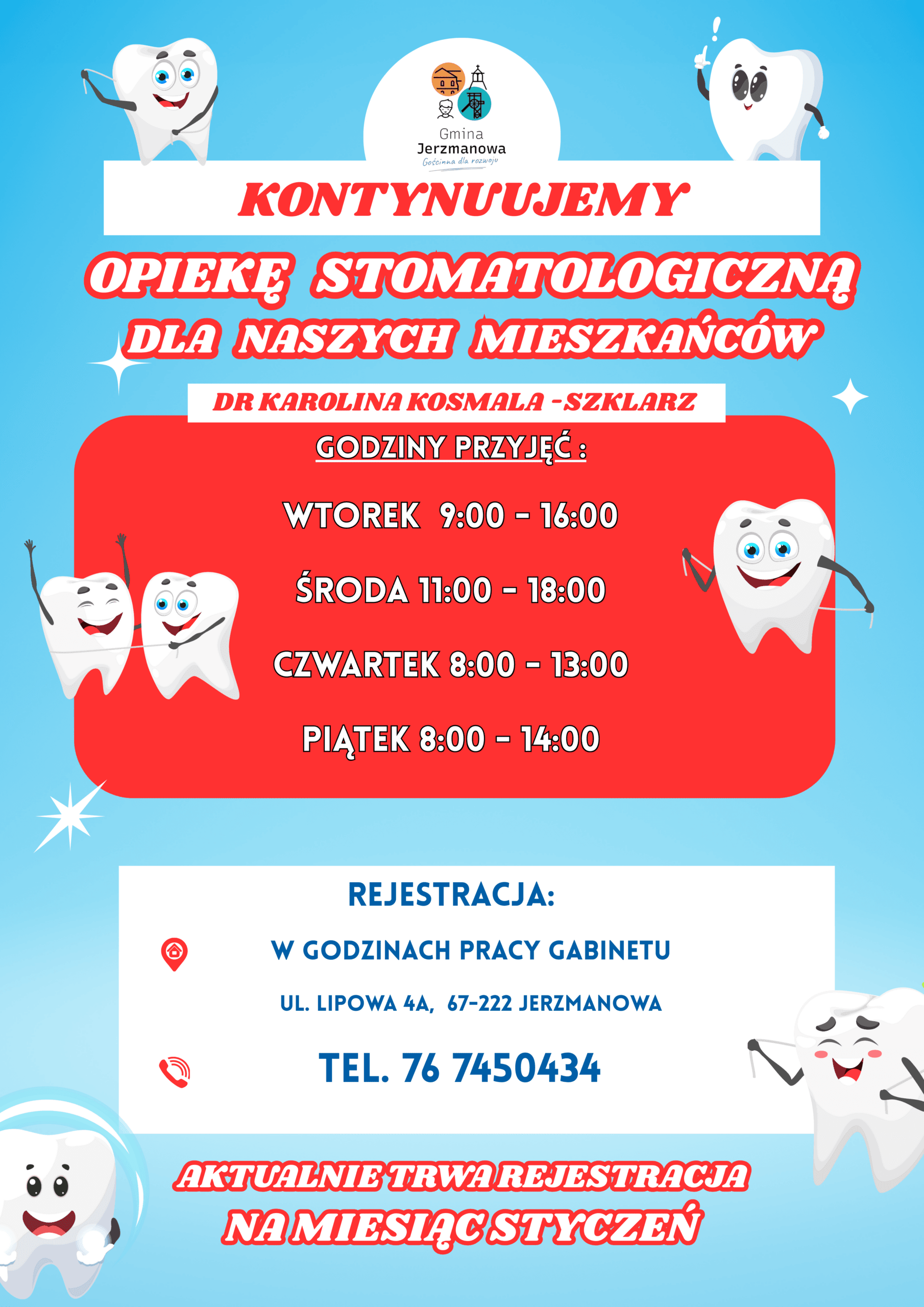 Zachęcamy mieszkańców do korzystania z dostępnej opieki stomatologicznej oraz do regularnego dbania o zdrowie jamy ustnej.
