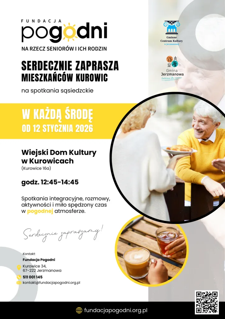 Fundacja Pogodni, działająca na rzecz seniorów i ich rodzin, serdecznie zaprasza mieszkańców Kurowic na regularne spotkania sąsiedzkie, które odbywać się będą w przyjaznej i otwartej atmosferze, sprzyjającej rozmowie, integracji oraz wspólnemu spędzaniu czasu.