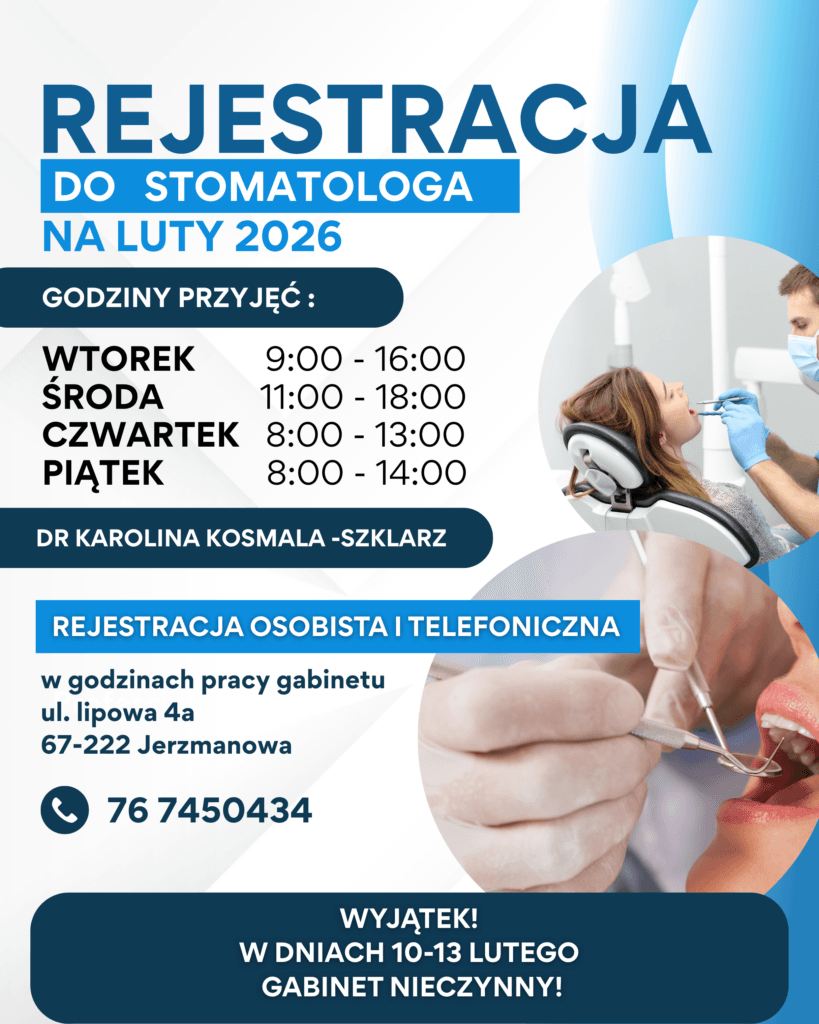Informujemy, że rozpoczyna się rejestracja na wizyty stomatologiczne dla mieszkańców Gminy Jerzmanowa na miesiąc luty u dr Karoliny Kosmali-Szklarz.