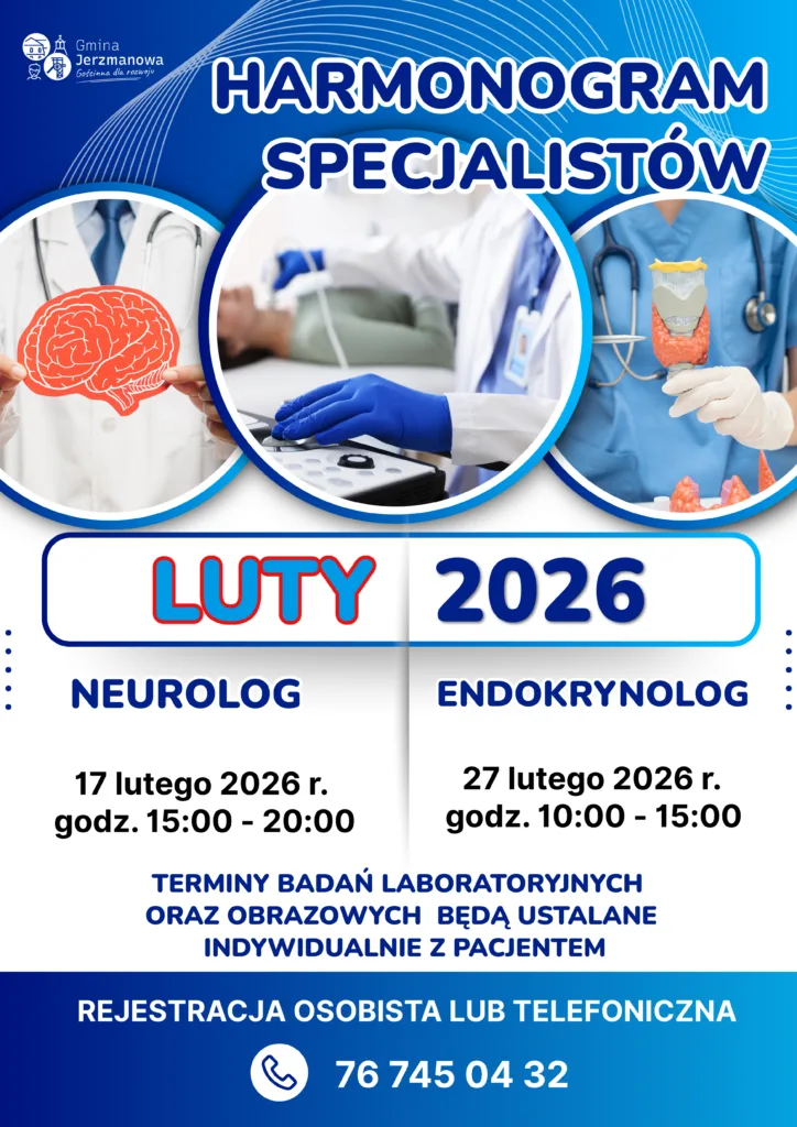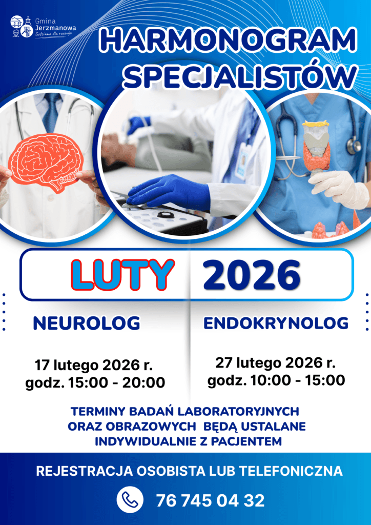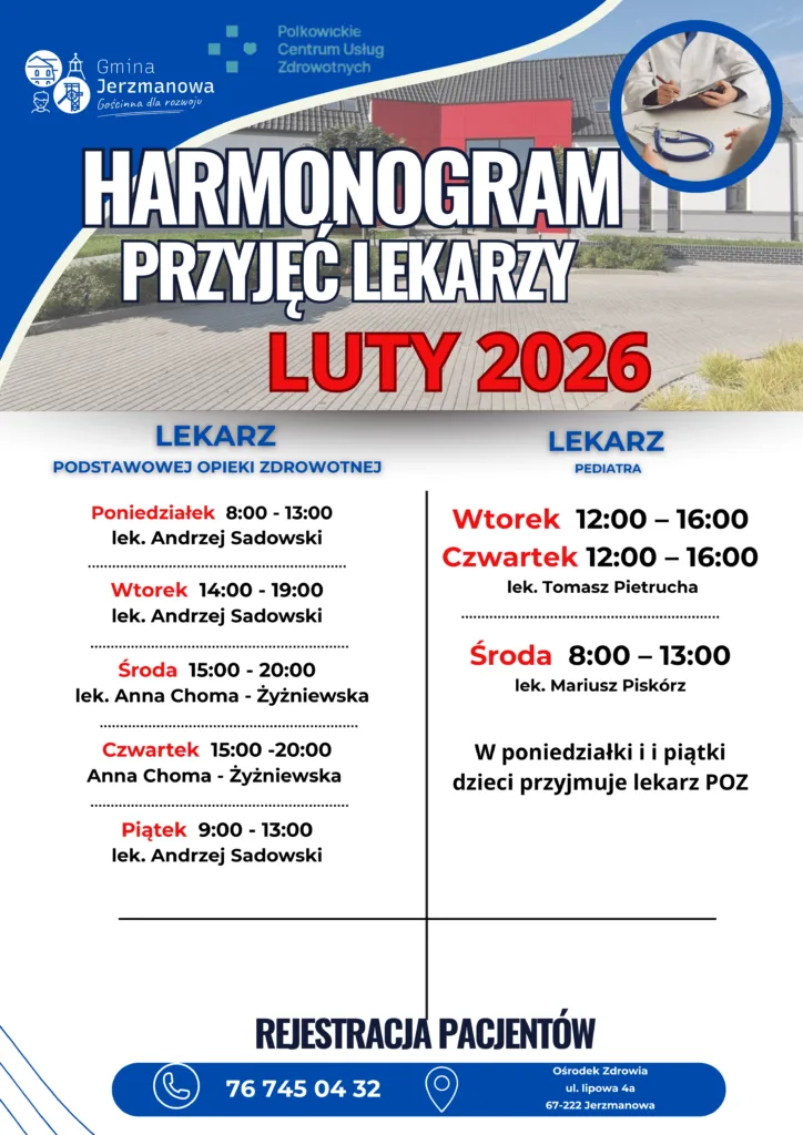 Informujemy, że został ustalony harmonogram przyjęć specjalistów oraz lekarzy podstawowej opieki zdrowotnej w Ośrodku Zdrowia w Jerzmanowej na miesiąc luty 2026 r.