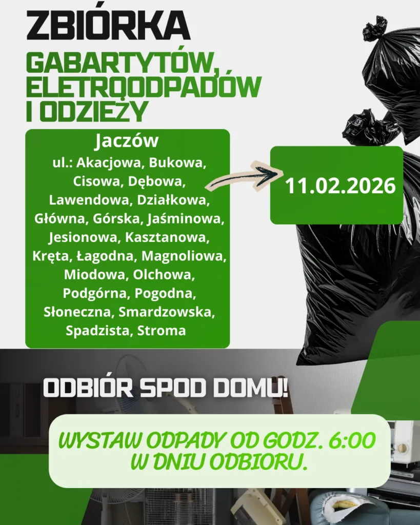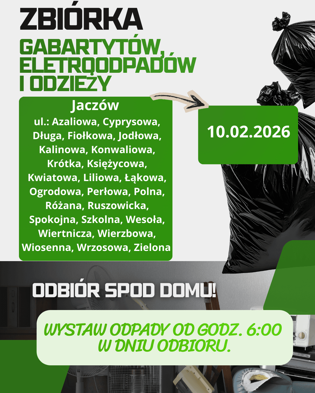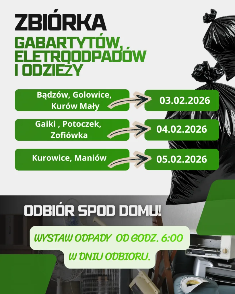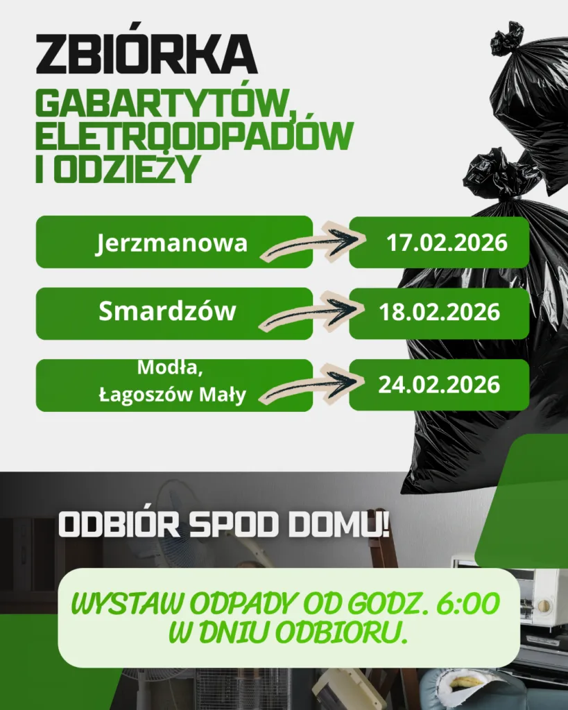 Informujemy mieszkańców, że w lutym 2026 roku na terenie naszej gminy rozpocznie się zbiórka odpadów wielkogabarytowych, a także zużytego sprzętu elektrycznego i elektronicznego (ZSEiE) oraz odzieży w ramach tzw. „wystawki”.