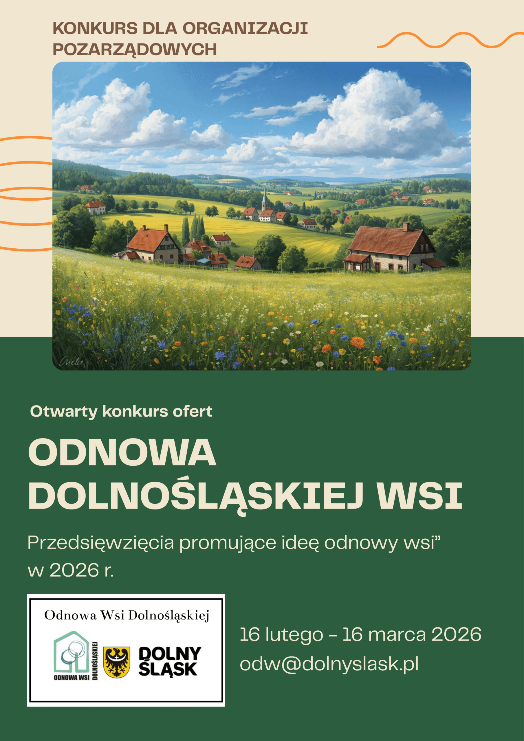 Informujemy, że Urząd Marszałkowski Województwa Dolnośląskiego ogłosił otwarty konkurs ofert na realizację zadania publicznego z zakresu działalności wspomagającej rozwój wspólnot i społeczności lokalnych pn. „Przedsięwzięcia promujące ideę odnowy wsi” w 2026 r.