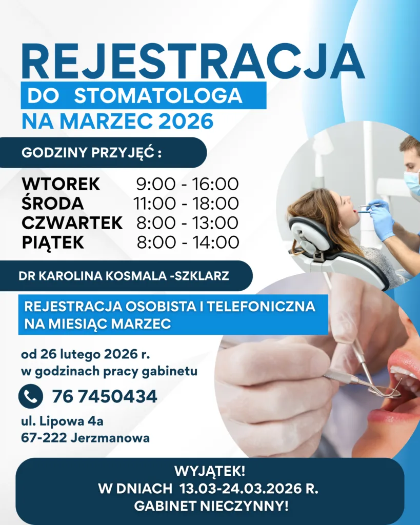 Uwaga: w dniach 13.03–24.03.2026 r. gabinet będzie nieczynny.
