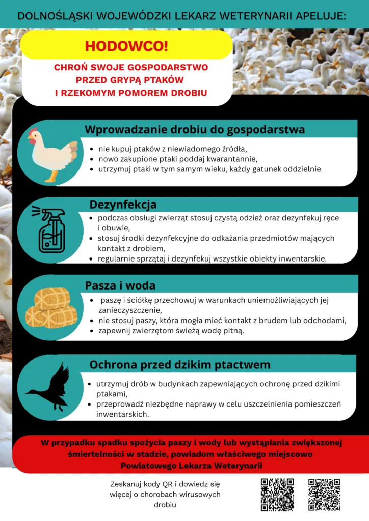 W związku z narastającą, wyjątkowo niekorzystną sytuacją epizootyczną, obejmującą liczne ogniska grypy ptaków (HPAI) oraz rzekomego pomoru drobiu (ND) na terenie kraju, Powiatowy Lekarz Weterynarii w Głogowie prosi wszystkich właścicieli drobiu o zapoznanie się z ulotką informacyjną dotyczącą wysoce zjadliwej grypy ptaków (HPAI) oraz rzekomego pomoru drobiu (ND).