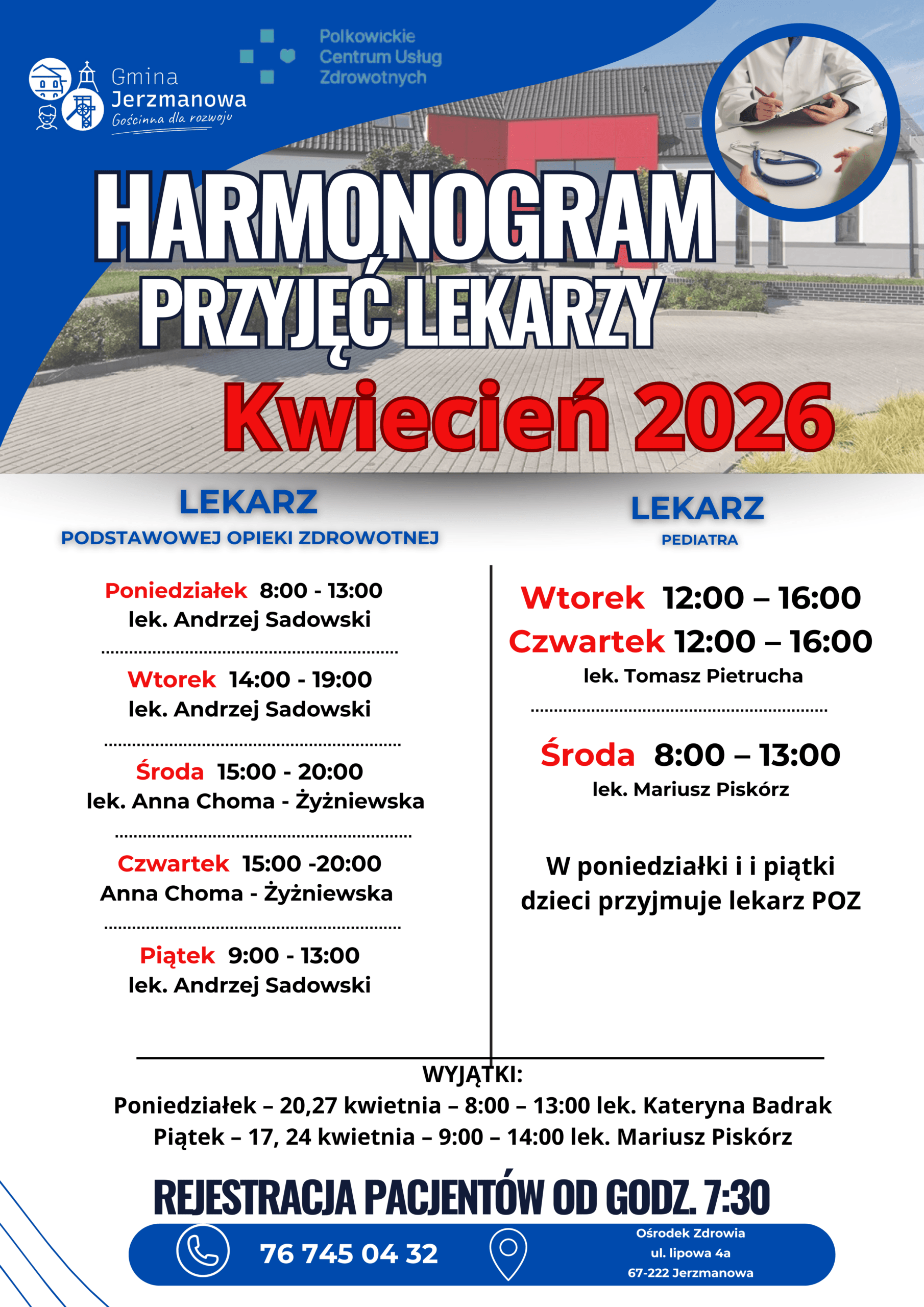 Rejestracja do lekarzy POZ i specjalistów odbywa się od godz. 7:30 pod numerem telefonu 76 745 04 32.