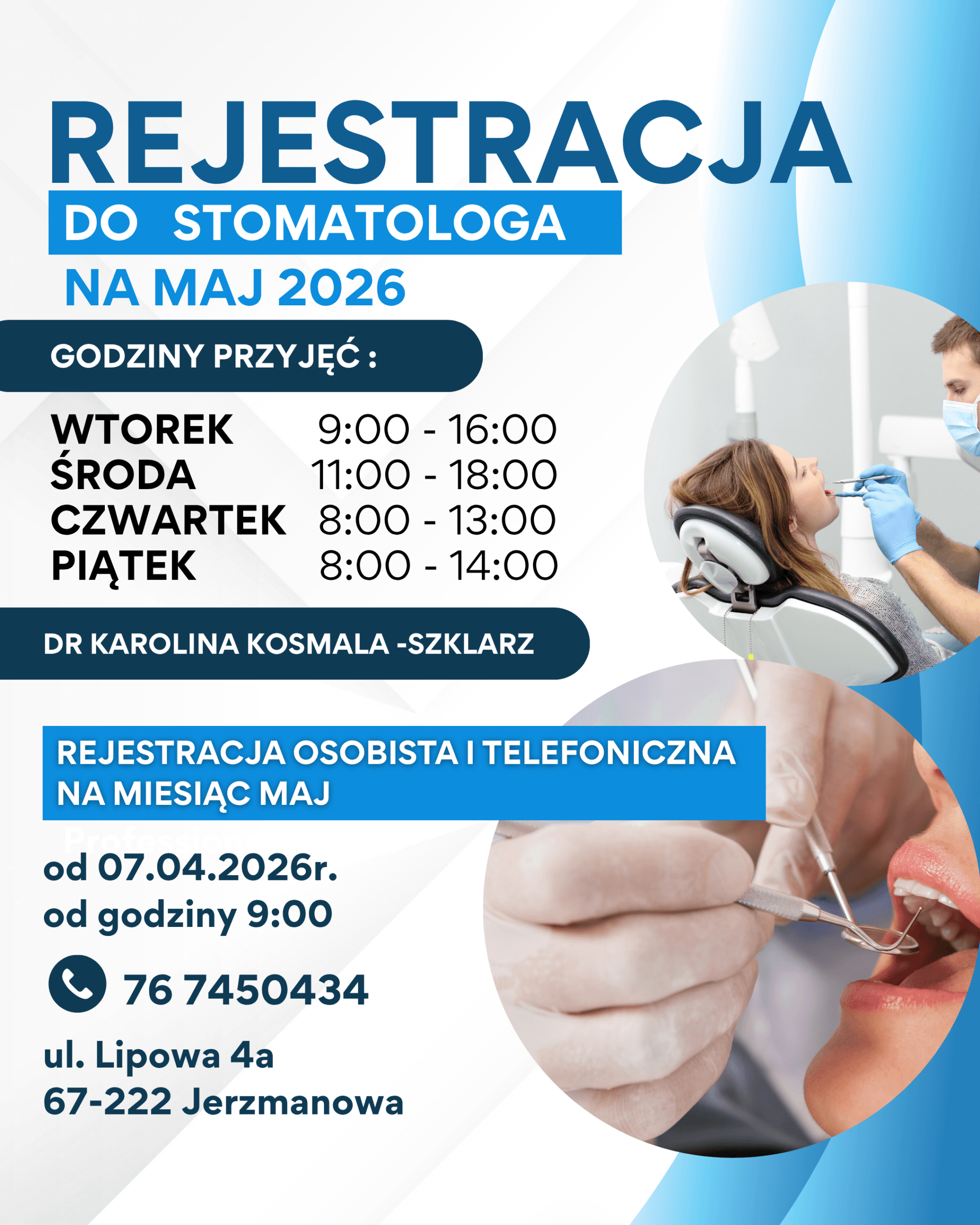 Rejestracja do stomatologa na maj rozpoczyna się 7 kwietnia 2026 r. od godz. 9:00 pod numerem telefonu 76 745 04 34.