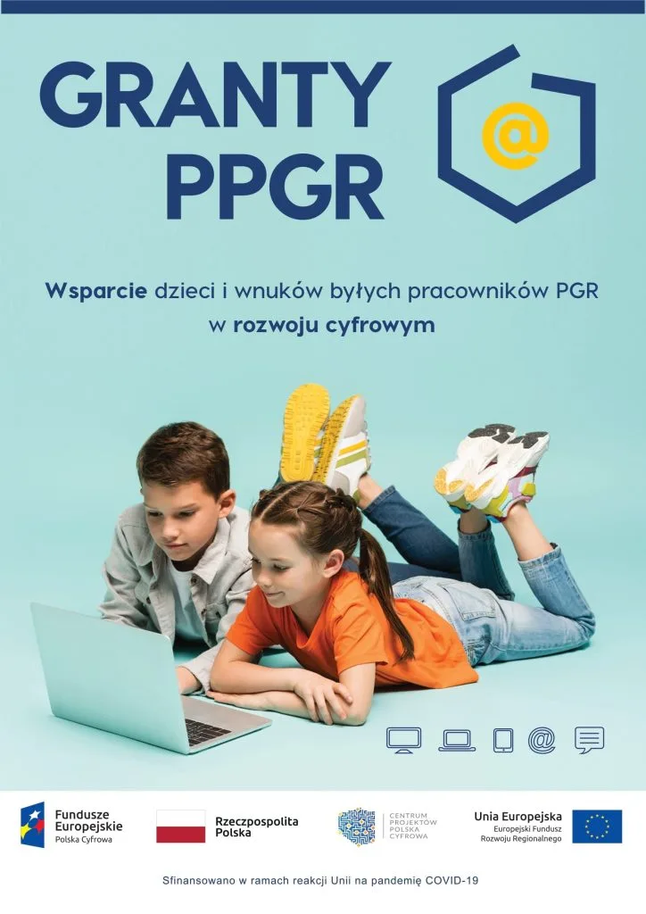 Przedmiotowe przedsięwzięcie realizowane jest w ramach Programu Operacyjnego Polska Cyfrowa na lata 2014-2020, Osi Priorytetowej V Rozwój cyfrowy JST oraz wzmocnienie cyfrowej odporności na zagrożenia REACT-EU, działania 5.1 Rozwój cyfrowy JST oraz wzmocnienie cyfrowej odporności na zagrożenia dotycząca realizacji projektu grantowego „Wsparcie dzieci z rodzin pegeerowskich