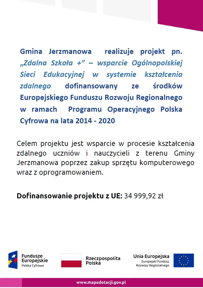 Zakupione laptopy zostaną przekazane szkołom podstawowym z terenu gminy Jerzmanowa tj. Szkoły Podstawowej im. Henryka Sienkiewicza w Jaczowie oraz Szkoły Podstawowej im. Jana Pawła II w Jerzmanowej. Następnie laptopy zostaną użyczone uczniom i nauczycielom celem poprawy jakości kształcenia na odległość.