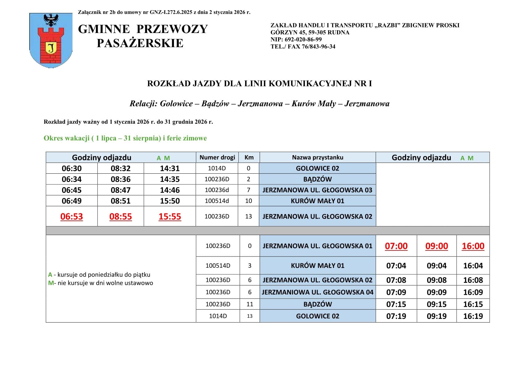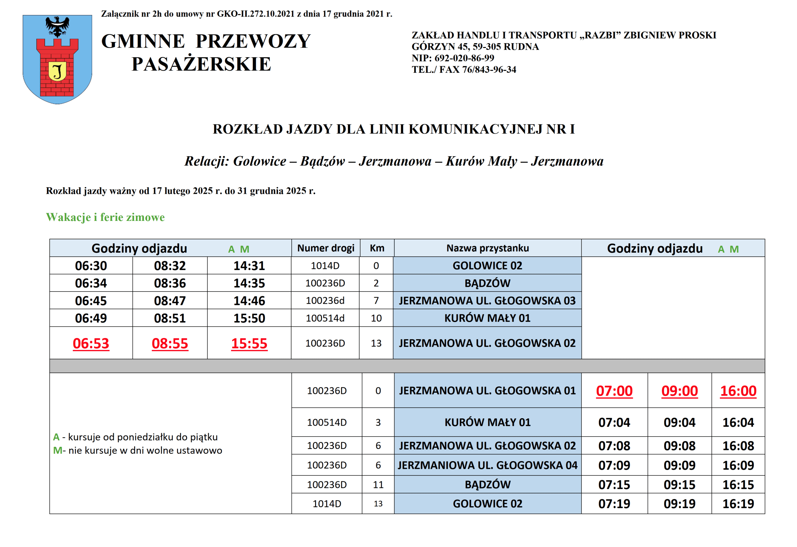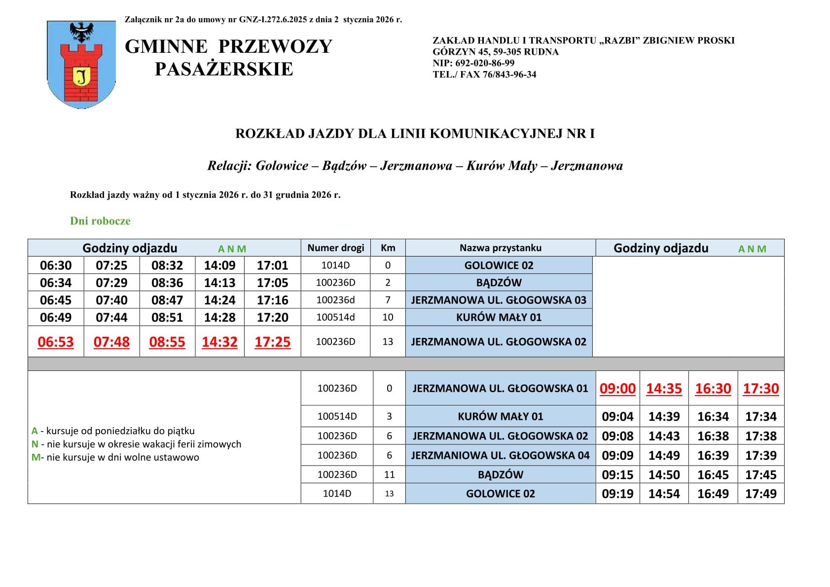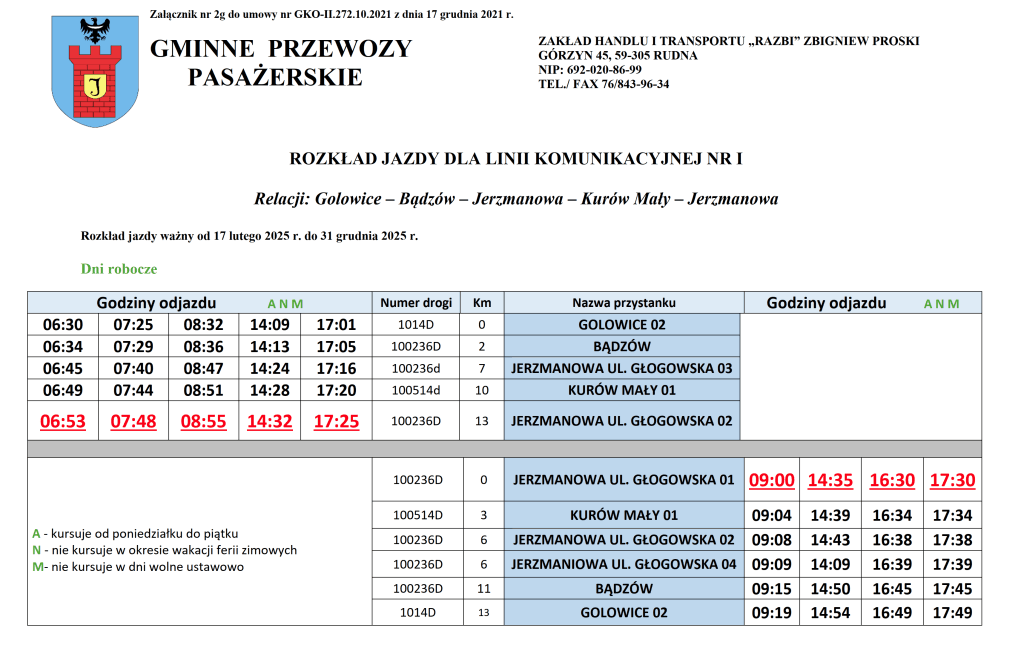 Gminne przewozy pasażerskie na trasie linii nr I oraz nr II, realizuje Operator publicznego transportu zbiorowego Firma: ZAKŁAD HANDLU I TRANSPORTU „RAZBI” Zbigniew Proski, z siedzibą w Górzynie 45, 59-305 Górzyn (Rudna).