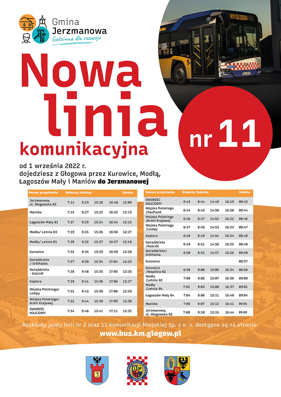 Rozkład jazdy linii nr 11 jest zsynchronizowany z rozkładem linii nr 2, która jeździ z Głogowa przez Jaczów i Smardzów do Jerzmanowej, co oznacza, że w miejscowości Jerzmanowa można się przesiąść z linii nr 2 na linię nr 11 i odwrotnie !