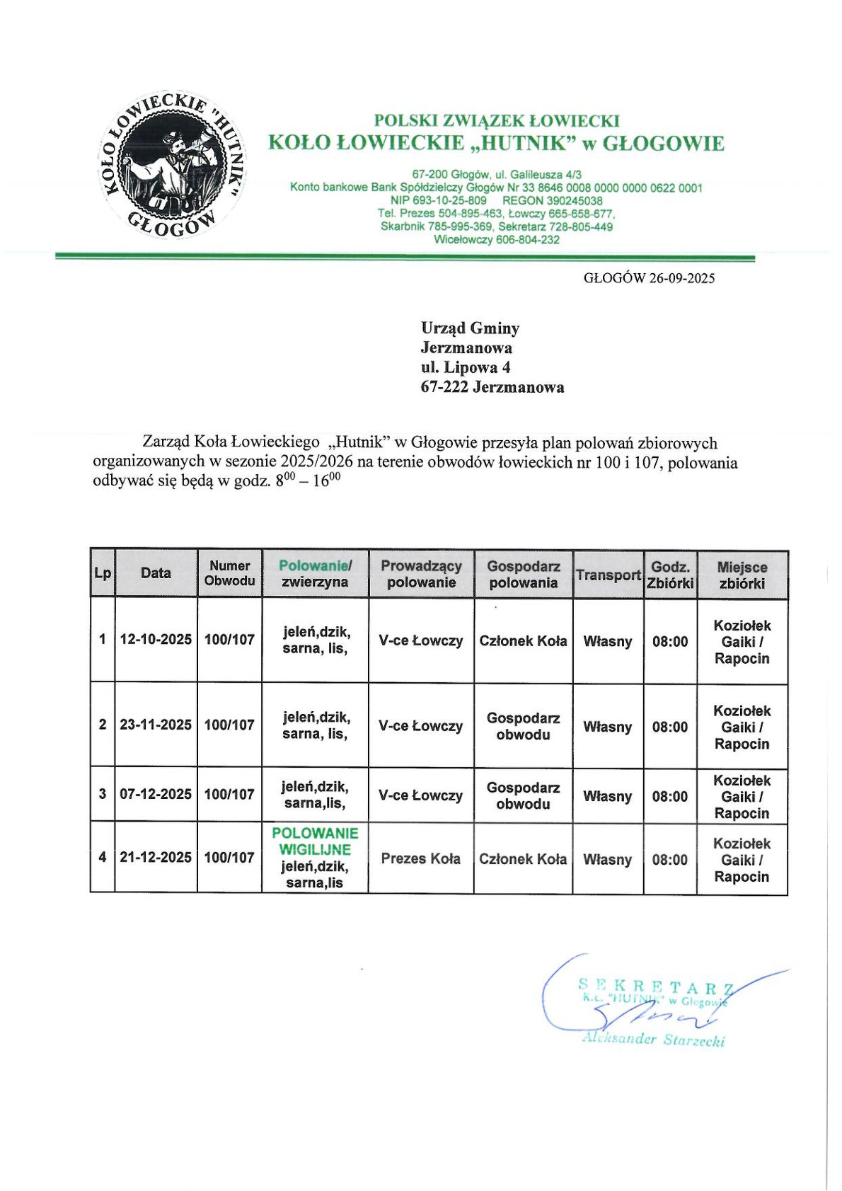 Urząd Gminy Jerzmanowa informuje, że Koło Łowieckie „Hutnik” w Głogowie przekazało plan polowań zbiorowych organizowanych w sezonie łowieckim 2025/2026. Polowania będą odbywać się na terenie obwodów łowieckich nr 100 i 107, w godzinach od 8:00 do 16:00.