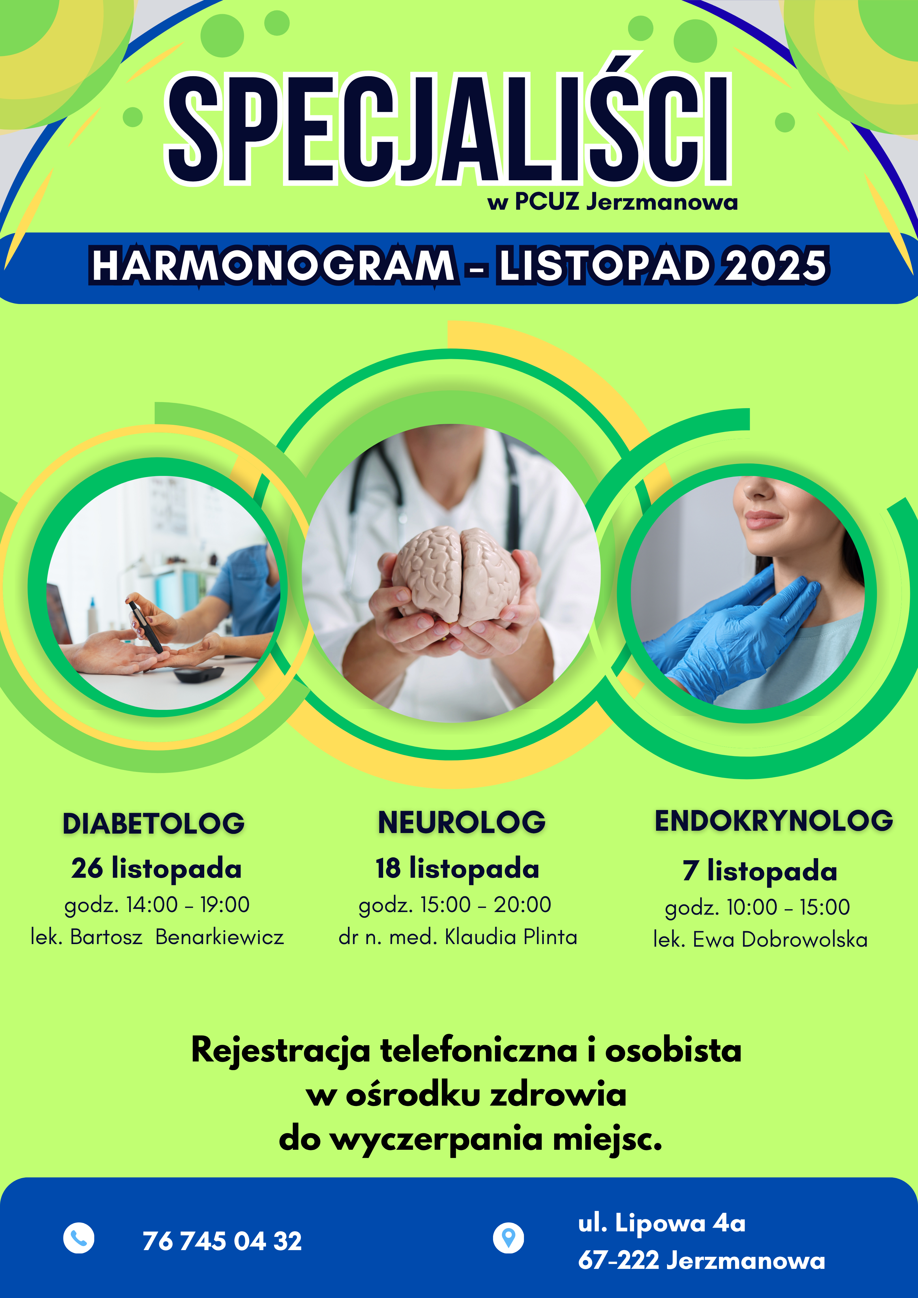 - Endokrynolog – lek. Ewa Dobrowolska – 7 listopada, godz. 10:00–15:00