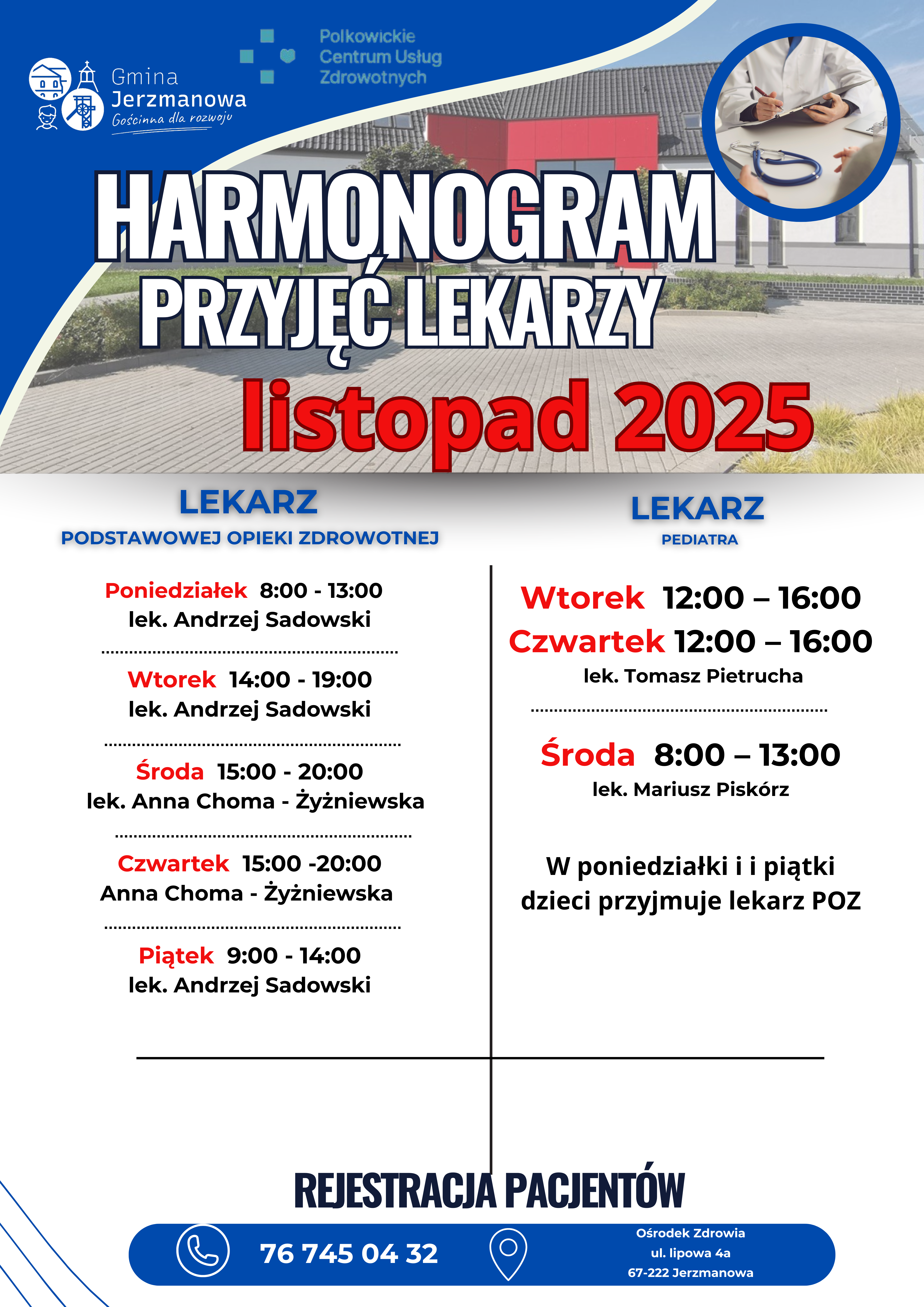 Harmonogram przyjęć lekarzy w Ośrodku Zdrowia w Jerzmanowej – listopad 2025