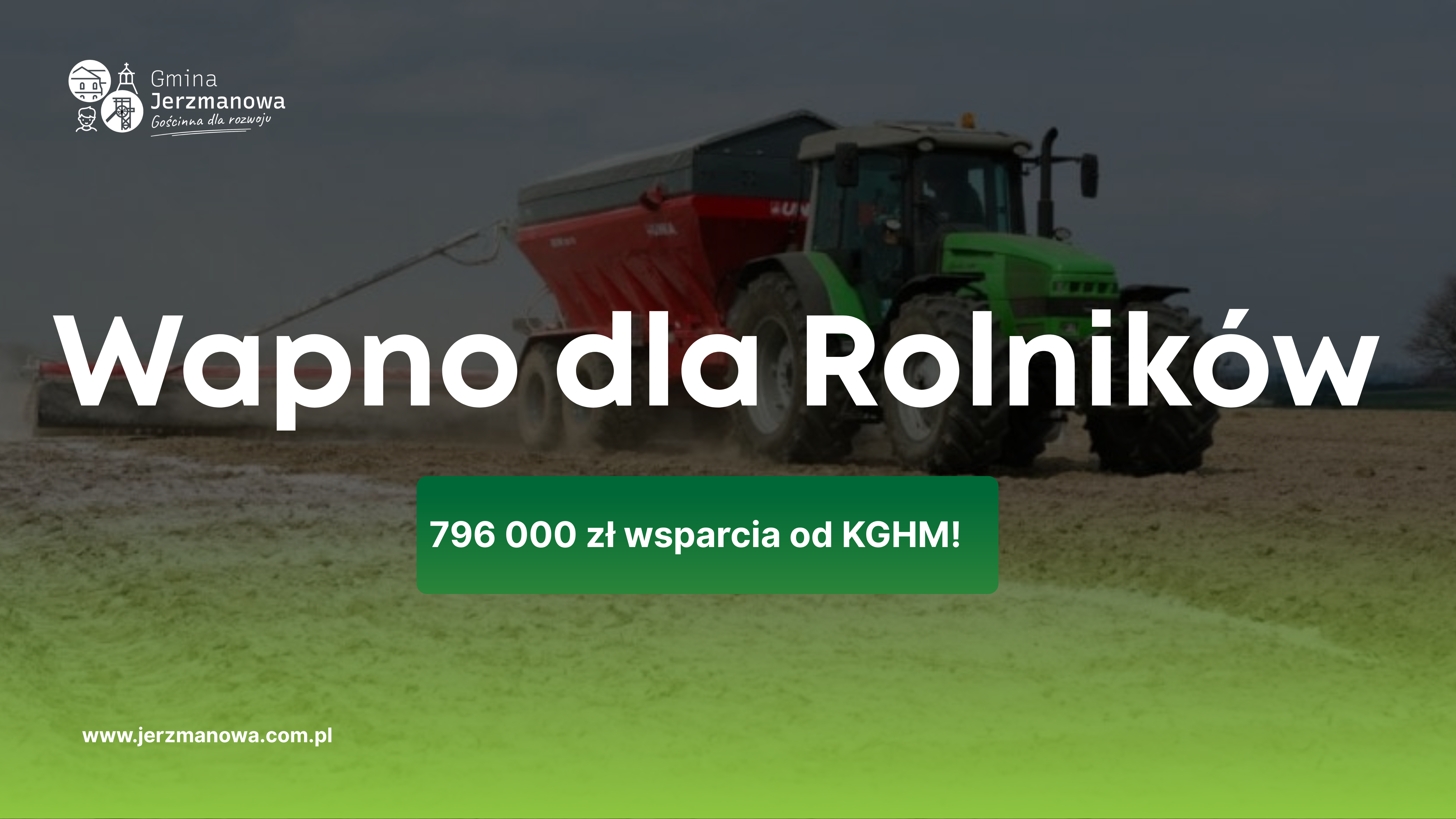 po długich staraniach, które rozpoczęły się jeszcze w 2024 roku, Gmina Jerzmanowa zawarła umowę darowizny z KGHM Polska Miedź S.A. na zakup wapna nawozowego z przeznaczeniem na wapnowanie gruntów ornych na terenie Gminy Jerzmanowa. Darowizna została przyznana m.in. na podstawie zebranych w kwietniu 2025 r. wniosków od Rolników posiadających grunty na terenie naszej Gminy. Kwota darowizny na ten cel wynosi 796.000,00 zł.