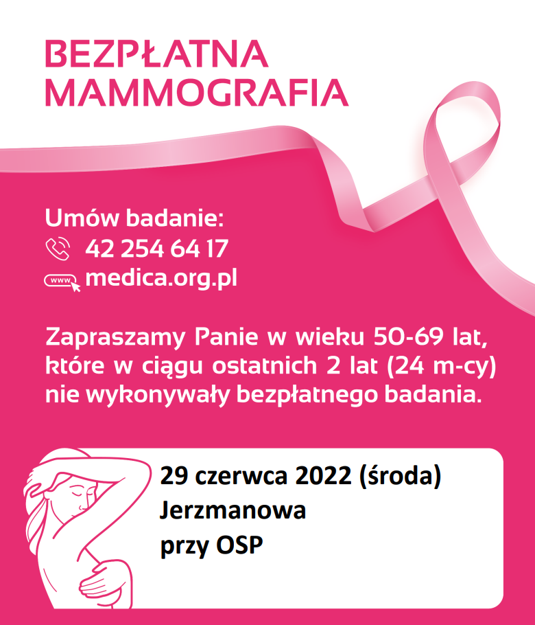 Zapraszamy Panie w wieku 50-69 na bezpłatną mammografię w dniu 29 czerwca 2022 – Jerzmanowa, przy OSP.